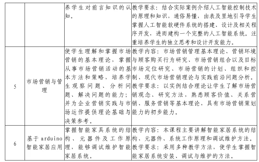 包括单片机与接口技术、三维建模与 3D 打印技术、工业机器人应用技术、人工智能技术、市场营销与管理、基于 Arduino 智能家居应用等。