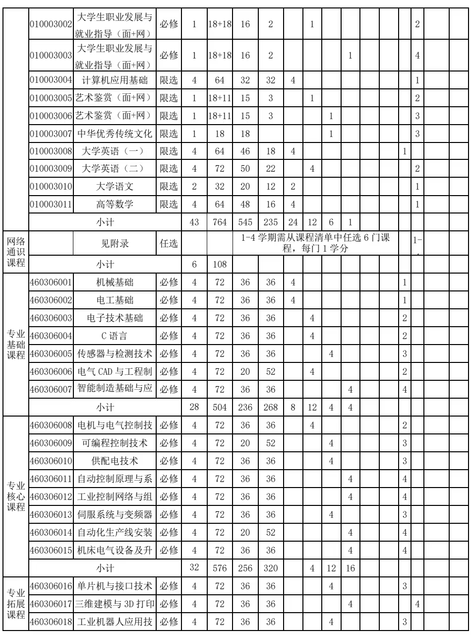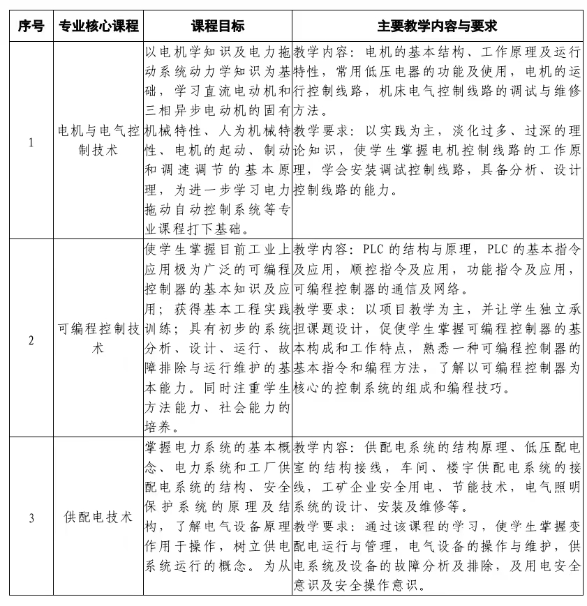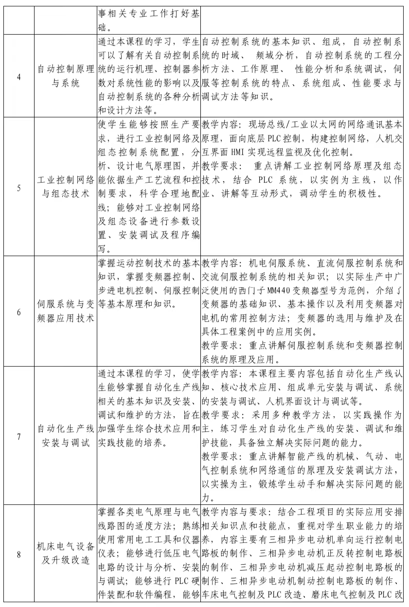 一般设置 6-8 门。包括电机与电气控制技术、可编程控制技术、供配电技术、自动控制原理与系统、工业控制网络与组态技术、伺服系统与变频器应用技术、自动化生产线安装与调试、机床电气设备及升级改造等。