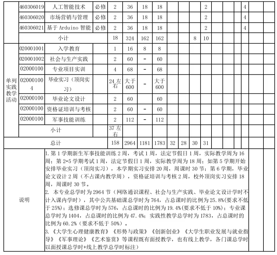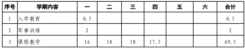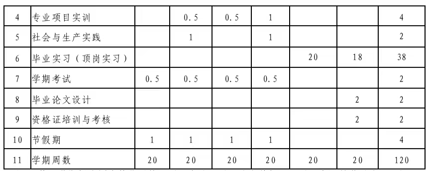(注:第 1 学期新生军事技能训练 2 周,考试 1 周,法定节假日 1 周,实际教学周为 16 周;第 2-5 学期考试 1 周,法定节假日 1 周,实际教学周为 18 周,如第 5 学期开始安排毕业实习(顶岗实习),本学期实习安排 20 周;第 6 学期,毕业论文设计 2 周,校外顶岗实习安排 18周)