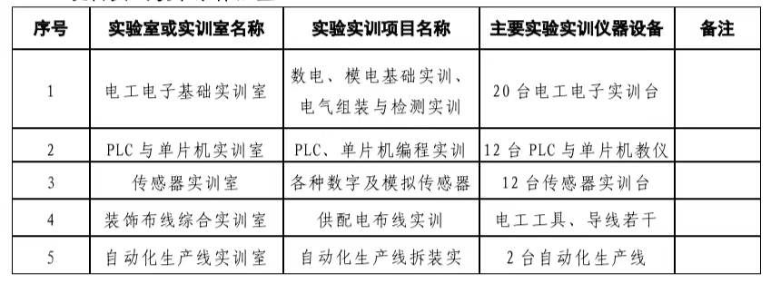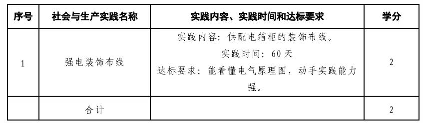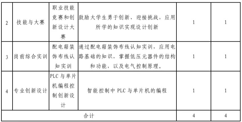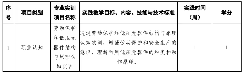a、实训课。根据岗位需求而开设的实训课包括电路基础实训、电工电子技术实训、配电箱安装接线实训、照明电路实训、电机拖动实训、机械控制电气线路实训、工业机器人应用实训、电气故障诊断实训、PLC 与单片机实训、传感器技术与原理实训等,通过技能训练使学生掌握从事电力电子行业的相关工作所必备的技能,同时养成良好的工作作风。