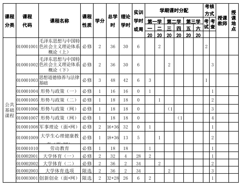 本专业开设公共基础课有思政《概论》、思政《基础》、形势与政策、心理健康教育、劳动教育、体育、计算机应用基础、创新创业、大学生就业指导、职业生涯规划、军事理论、艺术鉴赏、大学英语、大学语文、高等数学等。