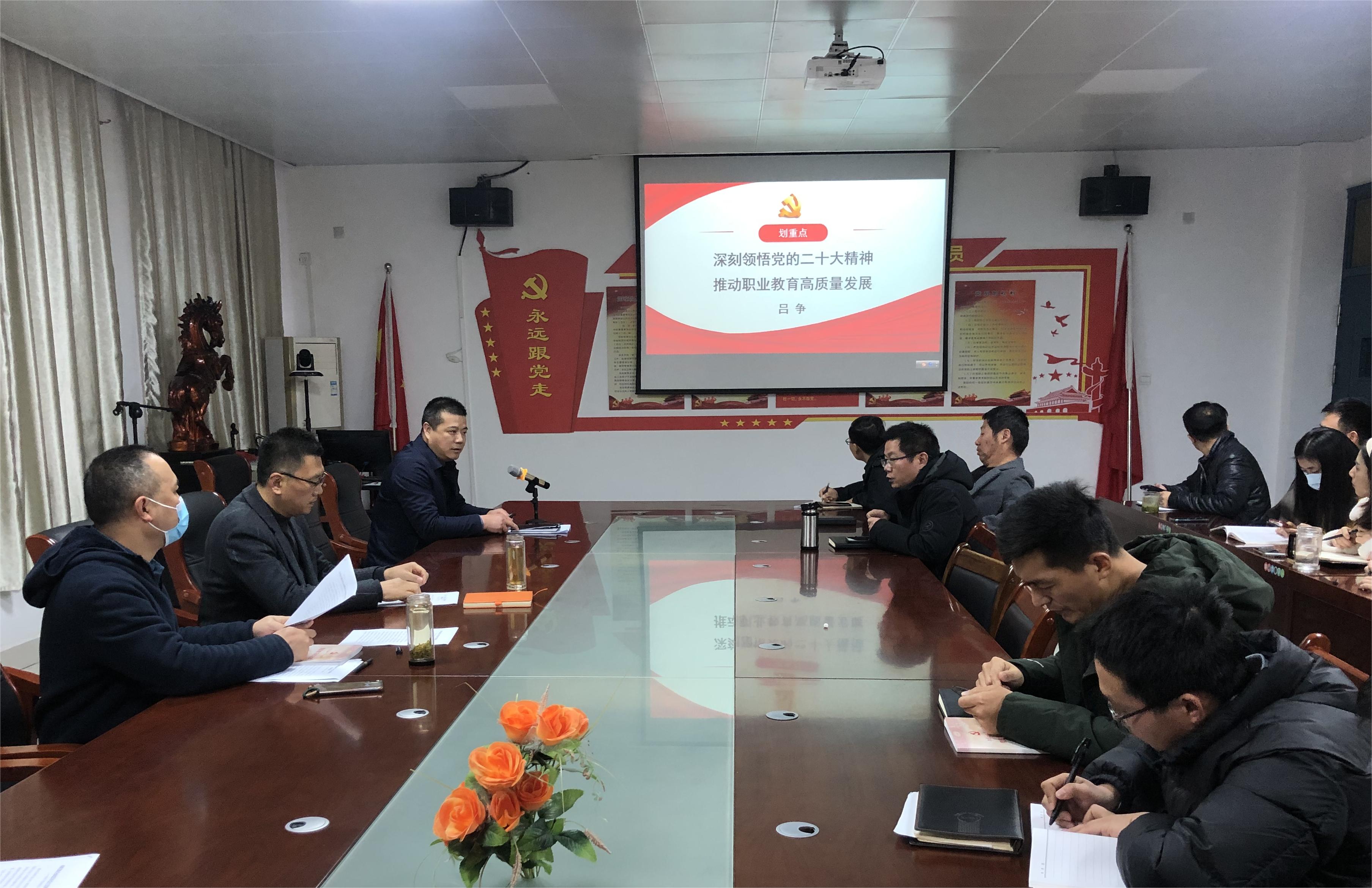 首先,吕争为学院全体教师做《深刻领悟党的二十大精神,推动职业教育高质量发展》专题党课。吕争从党的二十大主题、三个务必、党的中心任务、中国式现代化的五个特色等二十个方面以及党的二十大关于职业教育的重要论述进行了深入浅出的解读。吕争指出,作为职业教育工作者,一定要把学习贯彻党的二十大精神作为当前和今后一个时期的重要政治任务,要牢牢把握党的二十大关于职业教育的重要论述,要与学习领会贯彻习近平总书记关于职业教育的一系列重要指示、重要讲话和重要丰富实践结合起来,推动新时代职业教育高质量跨越式发展。